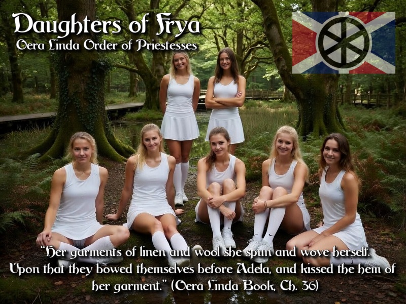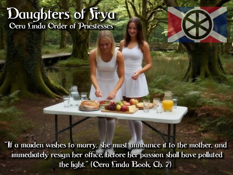 The Daughters of Frya are an initiatory Order of Priestesses dedicated to serving others and raising the energies of the earth, according to the teachings of the 13th century Frisian manuscript known as the Oera Linda Book, preserving knowledge dating back more than four millennia. Upon initiation, a Daughter of Frya takes the three vows listed above, firstly for a period of seven years, and then, should she wish to remain in the Order, for life.