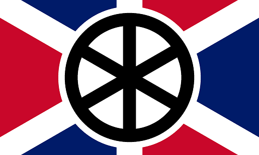[1.4] England’s new flag shall be the Yule Flag, with a six-spoked Frisian Yule Wheel representing the turning of the year. On a field 3:5, divided in a gyronny of six, blue (#012169) and red (#C8102E), a white saltire (½) and white pale (½), overall on a white roundel (2¾), a black Yule Wheel (2½), comprising a rim (¼) and six spokes (¼).